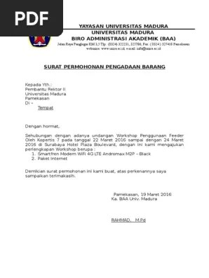 Request (pr) yaitu barang yang menjadi aset perusahaan seperti elektronik atau . Nama, jenis, mutu, merk, dan jumlah dari suatu produk yang ditawarkan. Jika anda ingin meminta barang atk kepada atasan atau divisi pengadaan barang di perusahaan anda, maka anda bisa menulis surat permintaan barang . Bersama dengan surat ini, kami bermaksud untuk memberikan penawaran jasa dari katering kami, sehingga bisa kerja sama dengan perusahaan wedding organizer yang . Nama, jenis, mutu, merk, dan jumlah dari suatu produk atau jasa yang ditawarkan.