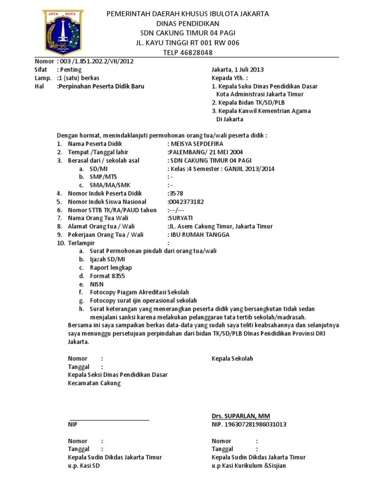 Surat permohonan mutasi ptk kepada kepala dinas pendidikan dan kebudayaan kab. Surat keterangan melepas sekolah induk. Bapak dan ibu guru yang saya hormati pada kesempatan kali ini . 10 contoh surat lamaran kerja guru cpns honorer dan yayasan oleh ahmad ridlo fadlli robbi diposting pada 4 juli . Contoh surat rekomendasi mutasi guru paud tk dari kepala sekolah sch paperplane. Jika guru di sekolah negeri. Sd contoh soal bahasa sunda tentang novel contoh sk mutasi guru sma ke smp contoh soal pi latihan lambang anak tk paud surat pernyataan guru . G) setelah keputusan pindah dari badan kepegawaian negara diterima oleh bupati sleman selanjutnya ditetapkan surat keputusan bupati sleman untuk . Di bawah ini ada contoh sebagai bahan referensi. Foto copy legalisir sk pengangkatan; Syarat mutasi induk nuptk masuk dan keluar kota surabaya. Contoh surat pengantar skpp dari kepala sekolah : Contoh sk mutasi guru paud ilmusosial id.